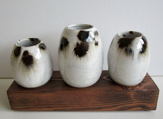 This is a zinc based white, glossy glaze onto which I flick a dark blue glaze (Lagano Blue, from Scarva Pottery) from a stiff paint brush. This is a table centrepiece that I sell with the wooden stand, that Alan kindly cuts and I stain and wax. These multi-vased pieces were inspired by Edmund de Waal's 'Water Shed' exhibition a couple of years ago. Mind you, Edmund had a couple of hundred pots lined-up, but when I get longer pieces of wood I'll be aiming for five, or maybe, even seven.